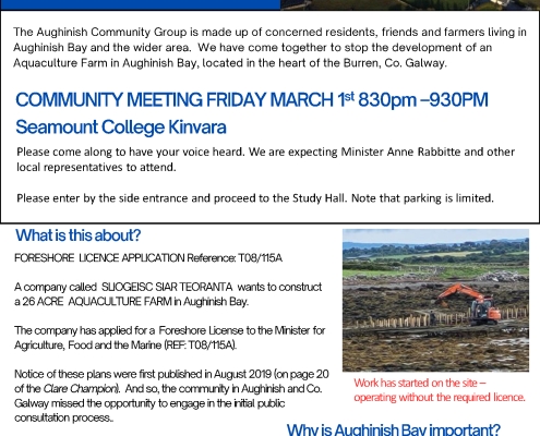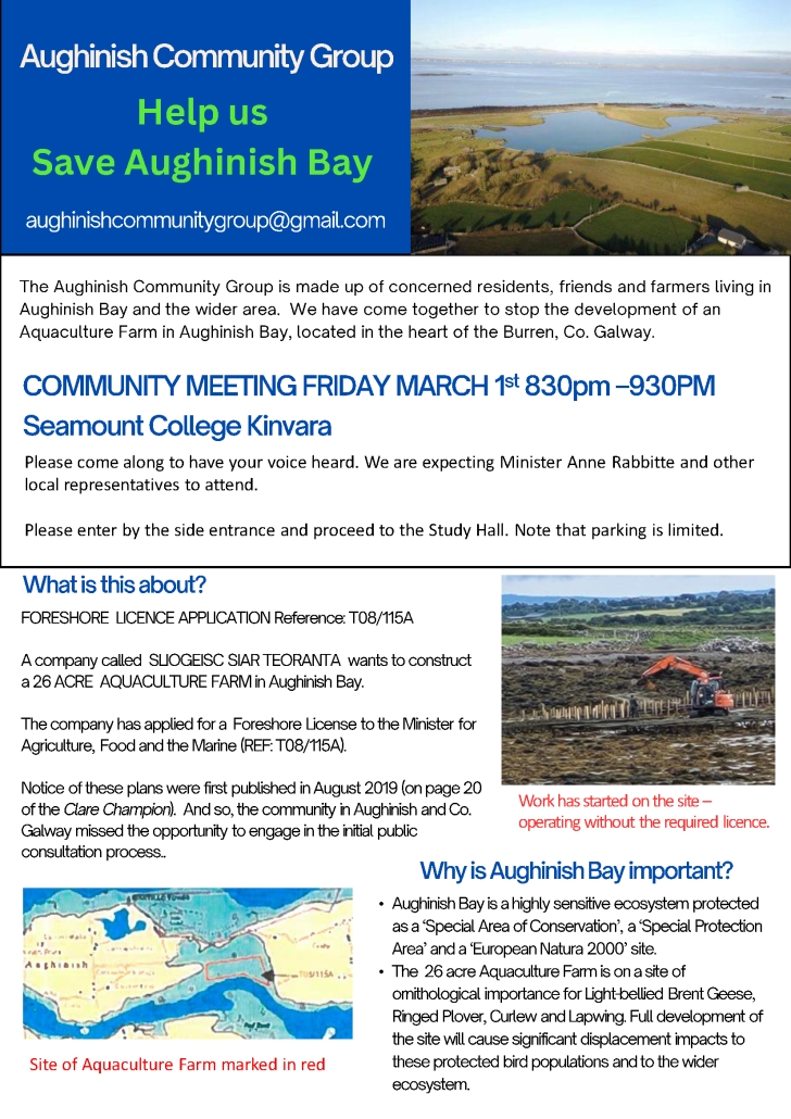 We are writing to request your support for our campaign to stop the development of a 26 acre Aquaculture Farm in the centre Aughinish Bay part of Inner Galway Bay. We are also inviting you to a public meeting about the development to be held on March 1st at 8.30pm in Seamount College (Main hall near the front office – side entrance).