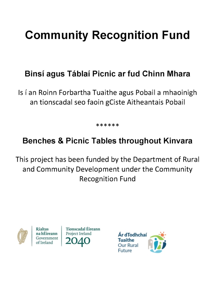 We would once again like to say a very big “Thank you” to the Community Recognition Fund. The Department of Rural and Community Development under the Community Recognition Fund, which enabled us to purchase the amazing stone benches and picnic tables throughout Kinvara.