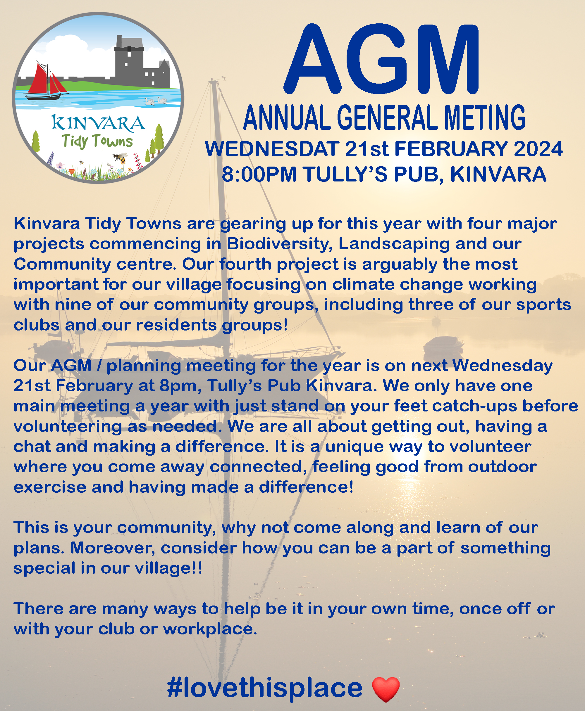 Next Wednesday, 21st February, is the Kinvara Tidy Towns AGM in Tullys Kinvara 8:00PM